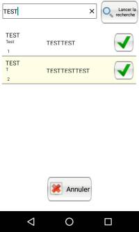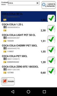 Rechercher un produit par mot clé à l'aide du clavier qui s'affiche, puis le sélectionner, puis cliquer sur la coche verte :