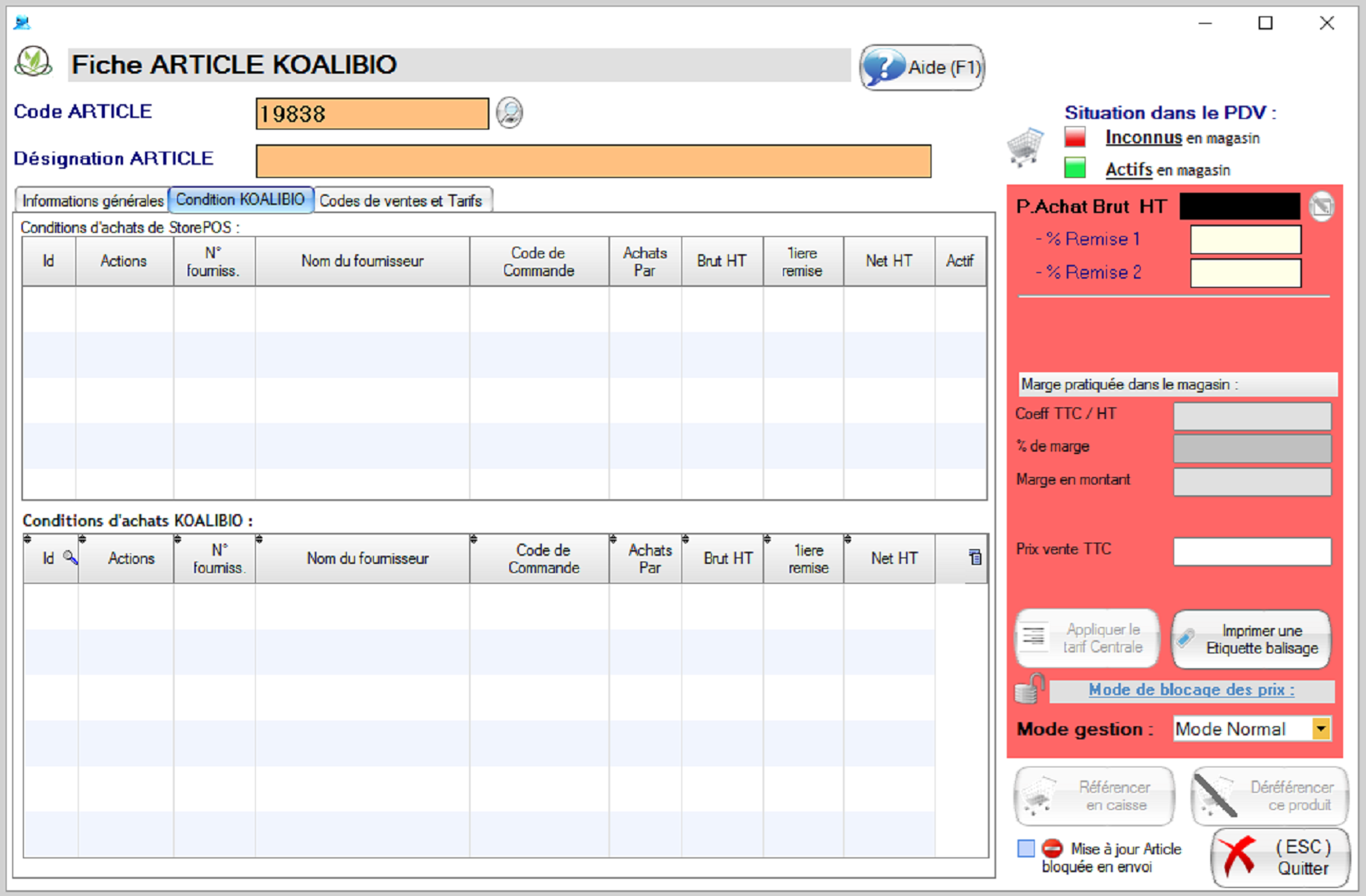 toutes les nuits l'import auto va télécharger les fichiers de la centrale sur un ftp commun a tout les sites les fournisseurs avec un numéro en dessous de 1.000.000 sont reserver pour la centrale les fournisseurs locaux doivent etre supperieur a 1.000.000 la recherche article ne sort aucune occurence de base il fat lui mettre des criteres de recherche dans cette liste il y aura autant de produits que de fournisseur mais uniquement a l'affichage en vrai il sont tous sur la meme fiches produit le tableau du haut montre les conditions actuelles au magasin alors que celui du bas nous montre les choix conseiller par la centrale il y un site web koalibio ou le client peut rentrer des informations qui redescendent a l'import auto mais il faut tout valider manuellement le client reste maitre de ses choix. un fichiers des vente remonte toutes les nuits a la centrale en attendant un dev pour regenerer les fichiers il faut aller dans import-auto.ini changer derniere_date=xxxxxxx les departement 10 a 22 sont reserver koalibio et tous ceux au dela de 60 sont les anciens de store pos