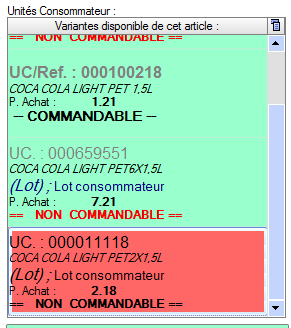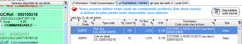 Chaque UC possède son code de commande, son (ou ses) code(s) EAN, ses tarifs, ses conditionnements de commande et ses disponibilités. Les parties 3 et 4 affichent donc les infos corespondantes à l’UC sélectionnée.