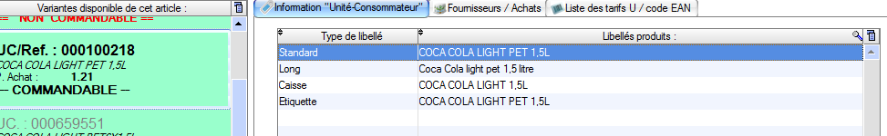 Il s’agit ici des différentes unités consommateur disponibles pur ce même produit. Vous constatez donc que pour ce produit il existe plusieurs variantes : le 6×1.5L, le 7×1.5L, le 1.5L et le 4×1.5L.