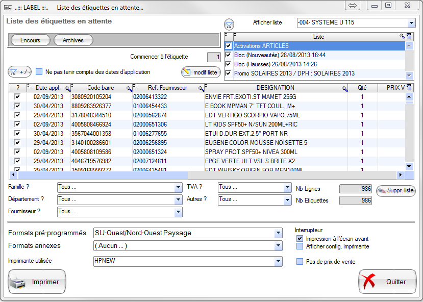 Les demandes d'étiqettes se font exclusivement dans Import Auto U115 pour tout ce qui concernne les produits centrale. Cela permet ainsi d'assurer que le code de commande imprimé sur l'étiquette est un code commande à jour.