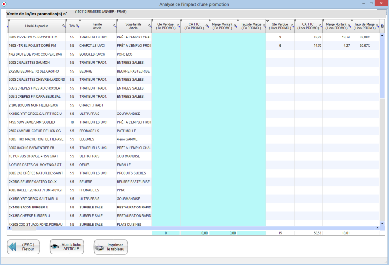Vous obtenez pour chaque produits de la promotion le CA ainsi que la marge dégagée :