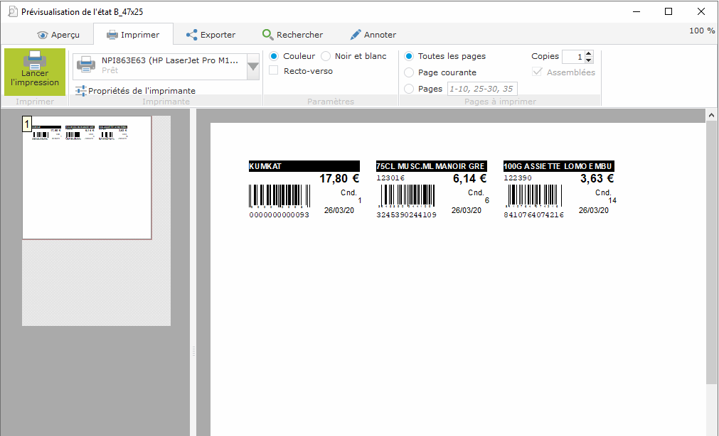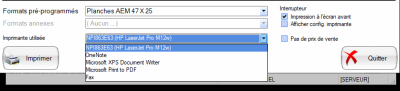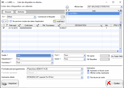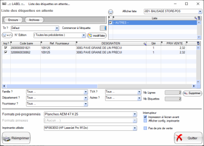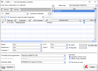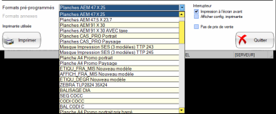 Les coches vous permettent d'avoir un aperçu avant l'impression et de vérifier les étiquettes qui vont être imprimées (Format, orientation,…). Egalement d'afficher la configuration de l'imprimante et de ne pas imprimer le prix de vente.