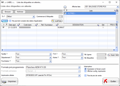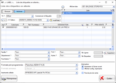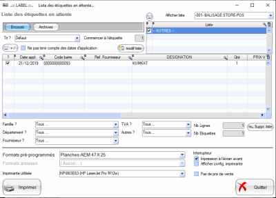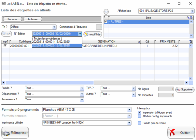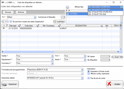 Vous arrivez sur la fenêtre des listes d'étiquettes à imprimer, dans laquelle vous retrouvez la liste d'étiquettes en attente d'impression.