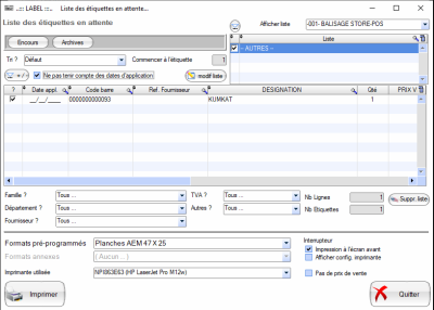 Vous arrivez sur la fenêtre des listes d'étiquettes à imprimer, dans la quelle vous retrouvez la liste d'étiquettes en attente d'impression.