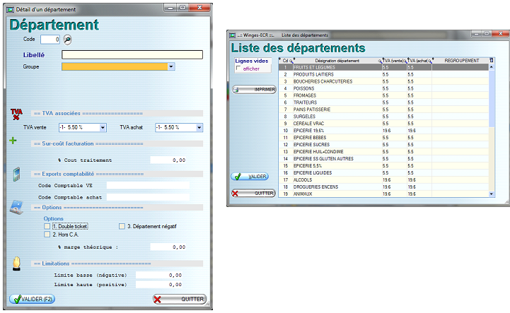 Cliquez sur le bouton « valider » pour afficher les informations concernant le département sélectionné. Dans cette fenêtre vous pouvez alors modifier la désignation du département et le taux de TVA qui lui est associé. Vous pouvez également spécifié si c’est un département Hors CA et/ou négatif. Cliquez sur « valider « pour enregistrer vos modification. (Par défaut la désignation département est de la forme « DEPARTEMENT … »).