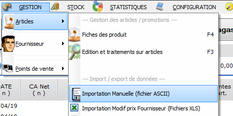 Pour accéder à l'import XLS cliquez sur le menu GESTION/Articles/Importation manuelle(fichier ASCII).