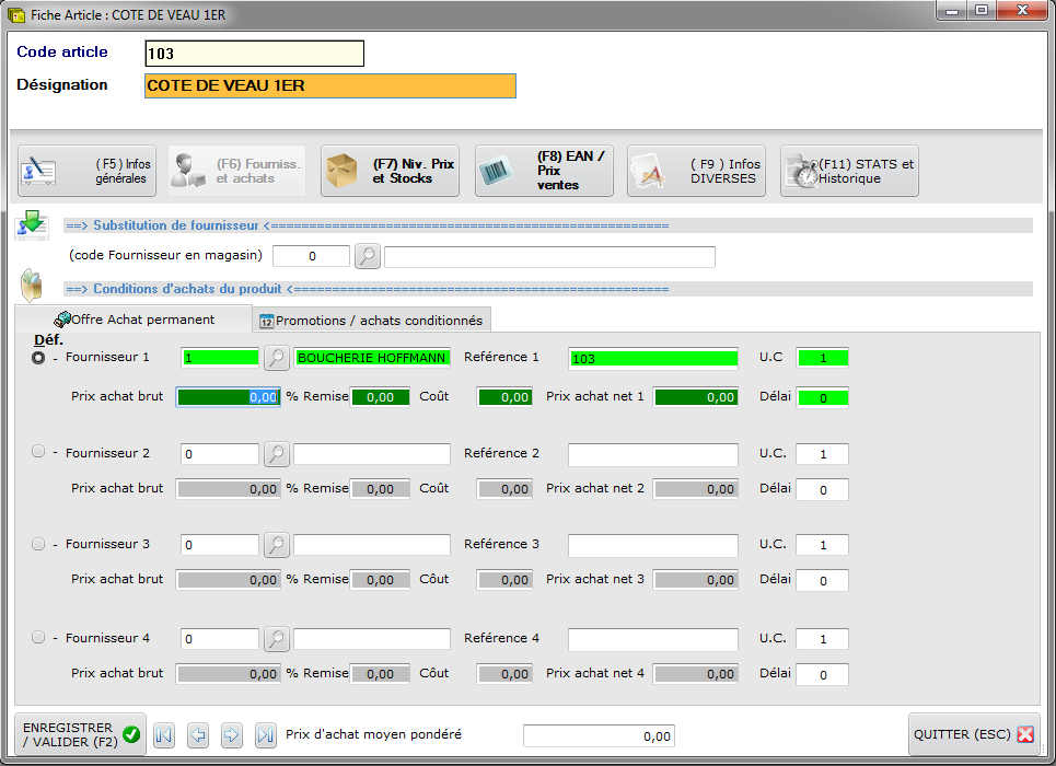 Dans cet onglet nous trouvons donc tout ce qui concerne l’achat de ce produit. Vous remarquez que vous pouvez avoir jusqu’à quatre fournisseurs par produit. Le fournisseur actif est indiqué sur un fond vert.
