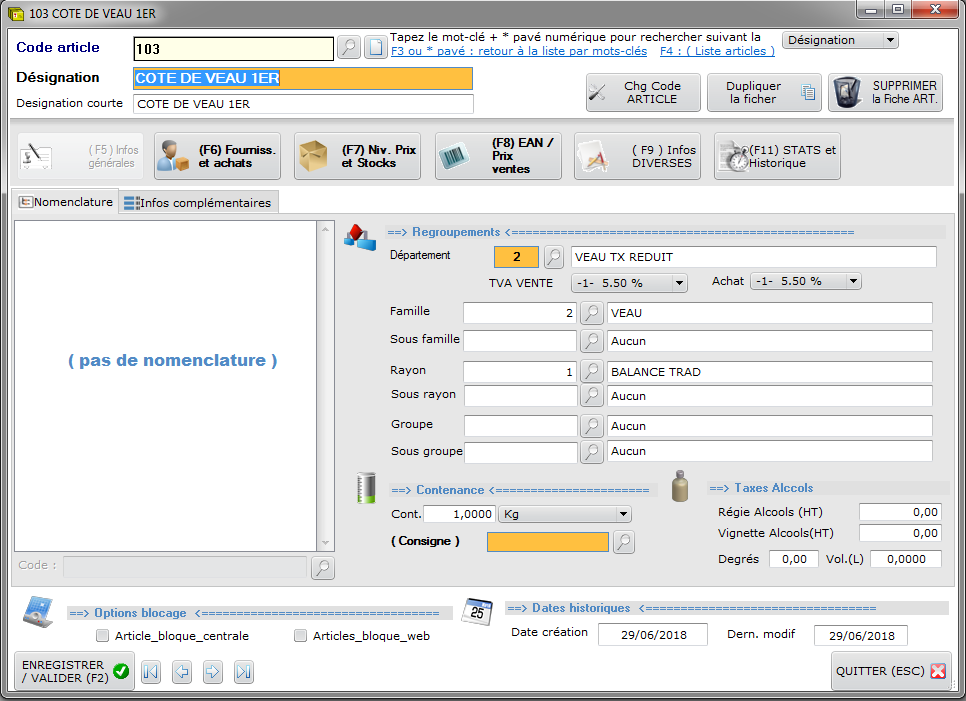 Nous trouvons dans cet onglet : les désignations du produit : c’est ce qui apparaîtra dans le magasin et sur le ticket de caisse. Les rattachements du produit : c’est la classification du produit ; son département, sa famille de rattachement. Ceci permet de définir correctement les TVA et de structurer votre fichier produit. Des informations concernant les conditionnements, les dates de création et de modification.