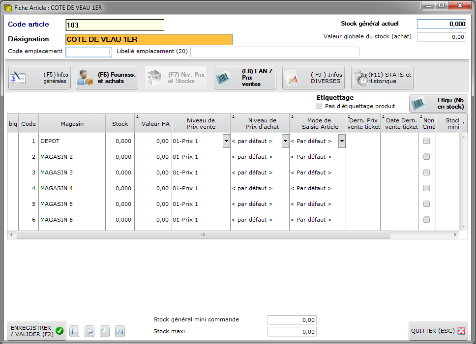 Dans cet onglet un tableau vous indique l’état des stocks par magasin (en quantité et en montant) ainsi que les niveaux de prix de vente dans chaque magasin.