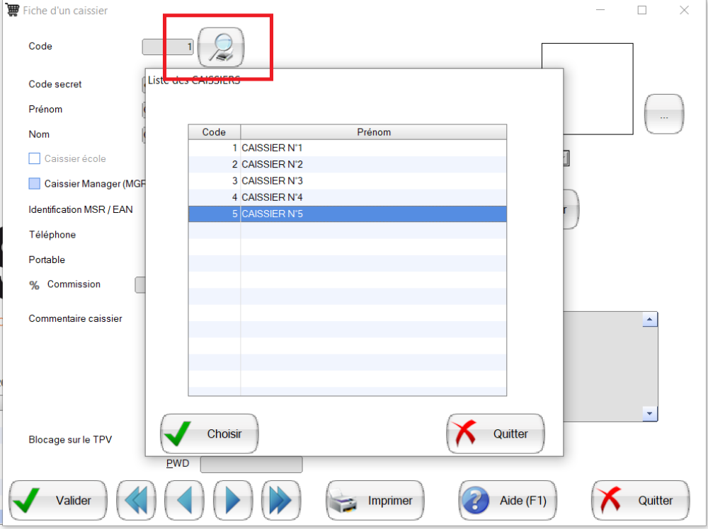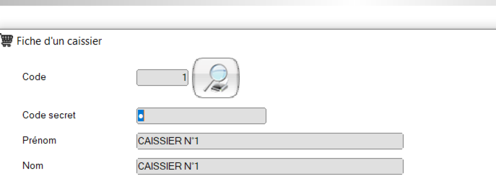 cette page va s'ouvrir sélectionner un caissier avec la petite loupe ou entrez directement son numero de caissier. Choisir un code secret ou modifier un code oublie. Renseigner ou modifier son prénom et son nom. Cocher si oui ou non c'est un caissier Manager, qui donne accès a des fonctions que les caissiers n'ont pas. * Cliquer sur “DROITS” et cochers les fonctions INTERDITES pour le CAISSIER. Saisir son numéro de EAN de badge, ou si il n y en a pas encore cliquez sur générer pour en créer un. si vous voulez lui faire un badge papier ou si vous avez une imprimante a badge cliquez sur imprimer. sélectionnez si vous voulez le voir, l'imprimer, le sauvegarder ou l'importer vers excel. si vous desirez l'imprimer choisissez soit votre imprimante A4 habituelle ou bien votre imprimante badge si vous en avez une. Renseigner son téléphone / portable Renseignez son pourcentage de commission si il en a un Vous pouvez bloquer ce caissier sur un TPV