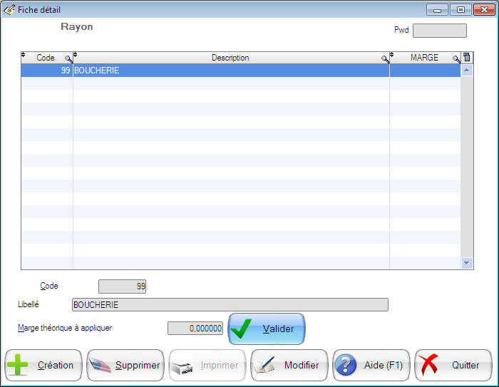 Pour créer un nouveau Rayon cliquer sur création  , cela vous créer automatiquement un nouveau numéro qu'il sera possible de modifier. Renseigner le libellé et valider en appuyant sur