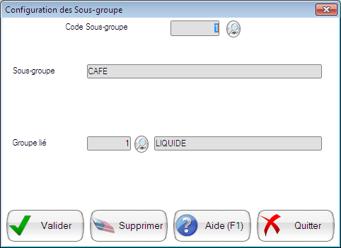 Pour créer un nouveau Sous-Groupe Chercher avec la loupe un code libre puis le inscrire dans le champs Code Sous-groupe  Renseigner le libellé et/ou le groupe lié et valider en appuyant sur
