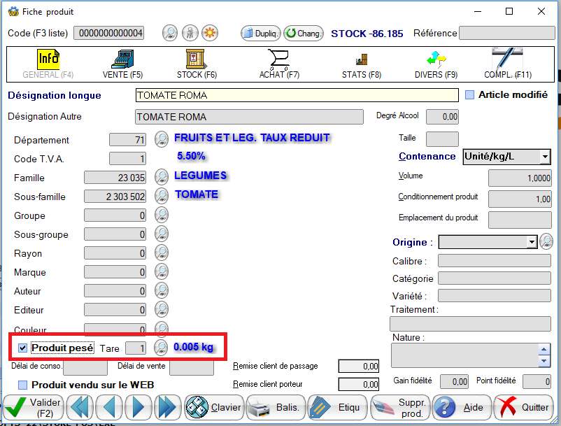 Pour affecter une tare aller dans Une Fiche Produit et renseigner la tare sur les produits pesés