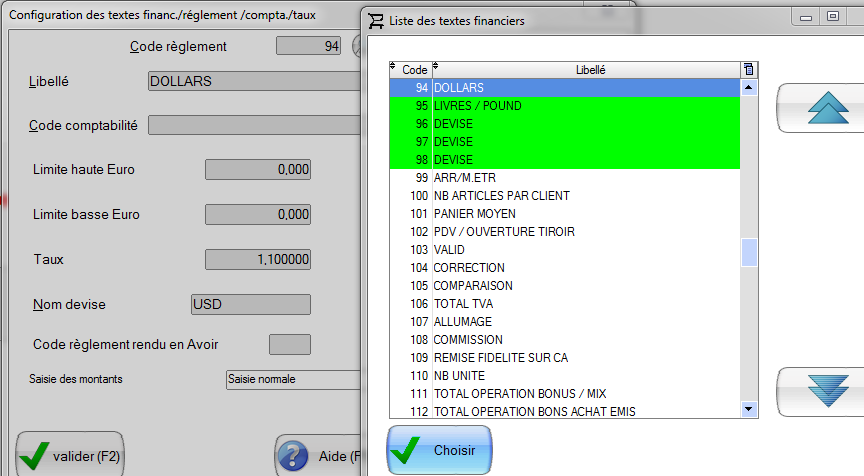 Allez dans les textes financiers via le menu CONFIGURER/TEXTES FINACIER  et sélectionner l'une des devises (code compris entre 94 et 98)