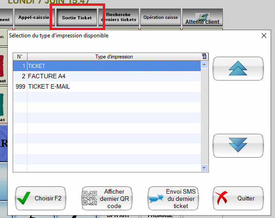 Lorsque vous appuyez sur Sortie Ticket (pour réimprimer le dernier Ticket)