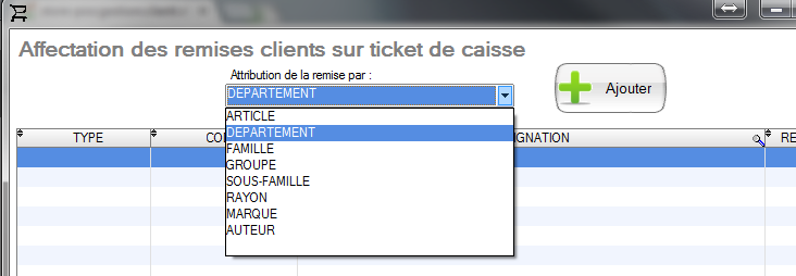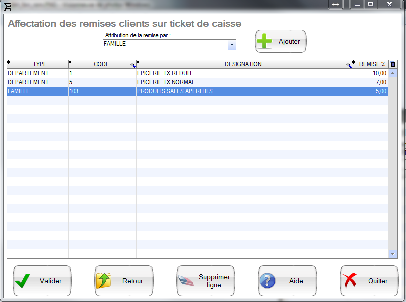 Puis choisissez à quel niveau vous souhaitez appliquer les remises (département, familles, produit,…)