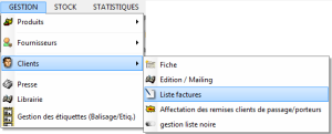 Pour accéder à la listes des relevés de factures ou pour rechercher un client par un numéro de relevé sélectionnez le menu GESTION- Clients - Liste factures