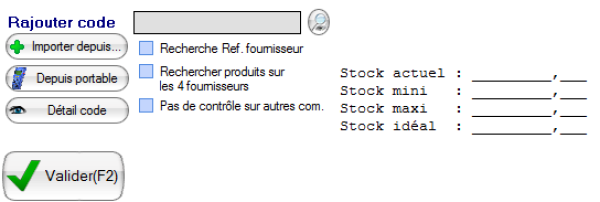 - Rajouter code : Permet de rajout un produit soit en le scannant directement, soit en a l'aide de la Loupe pour le recherche dans la liste des produits.