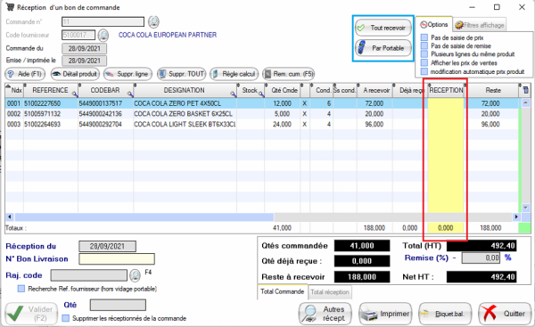 Vous ainsi renseigner les quantités réellement reçues (Cadre rouge) pour chaque ligne.