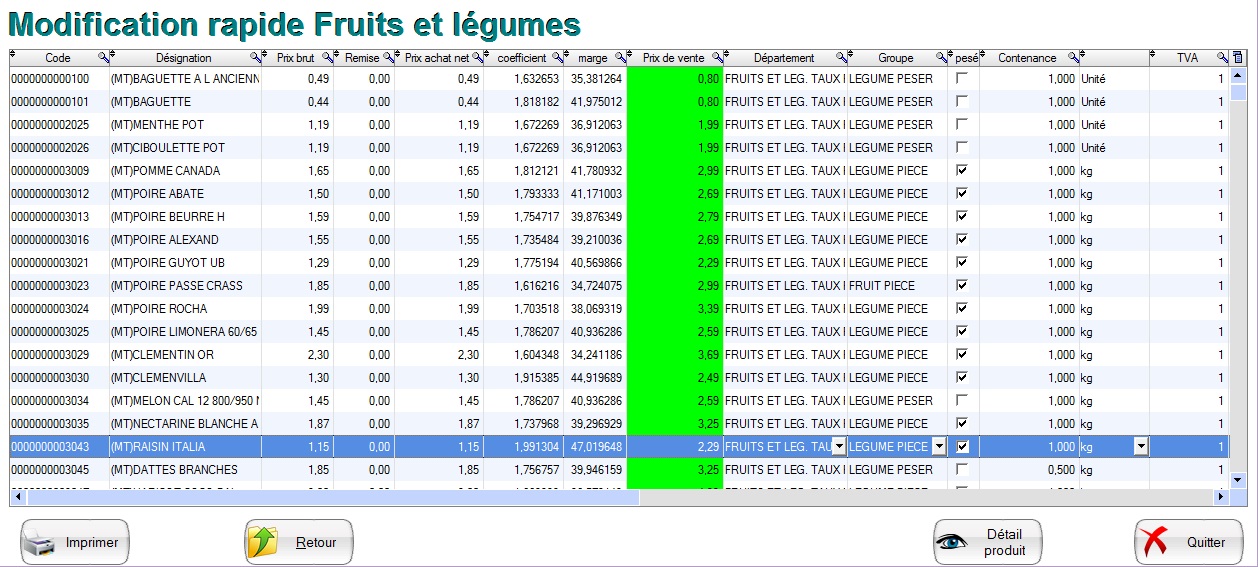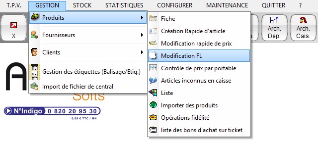 On accède aux modifications fruits et légumes via le menu Gestion→Produits→Modification FL