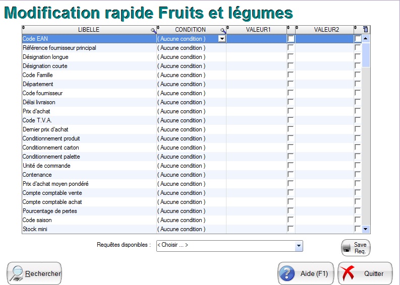 Vous arrivez sur la page Modification rapide Fruits et Légumes: Cette fenêtre vous propose une liste de critères afin d'effectuer une recherche dans la base articles de l'ordinateur. Plus vous remplissez de critères plus le résultat sera pertinent.