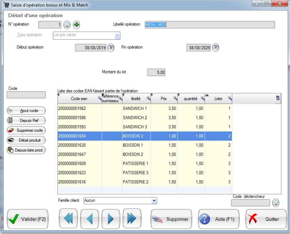Cette opération a pour but de faire un prix de lot sur une gamme d'articles choisis par vos soins, prenons l'exemple d'une formule midi, avec un sandwich, une boisson, et un dessert. vous pouvez avoir différents types de sandwichs, Boisons, ou desserts, il vous suffira juste de renseigner dans la colonne liste le numéro de la liste auquel ils appartiennent : exemple les sandwichs en 1, les boissons en 2, les desserts en 3, n'oubliez pas de renseigner le prix de lot, qui doit être inférieur à la totalité des articles bien évidement, et les dates de l'opération, ci dessous l’opération paramétrée ainsi que le résultat en caisse.