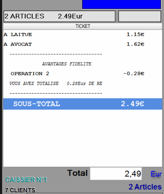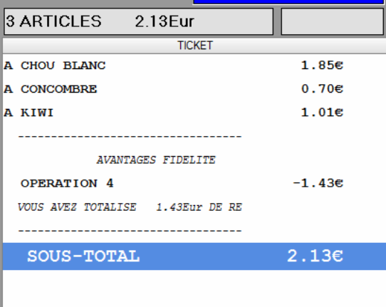 Il est constitué de X articles différents avec X remises affectées aux produits, et permet de créditer un gain fidélité à chaque fois qu’un client porteur achète un produit de la liste. Exemple : 1 sachet de chips avec une remise de 30 cts et 1 paquet de bonbon avec une remise de 40 cts génèrent un gain fidélité de 70 cts.