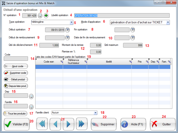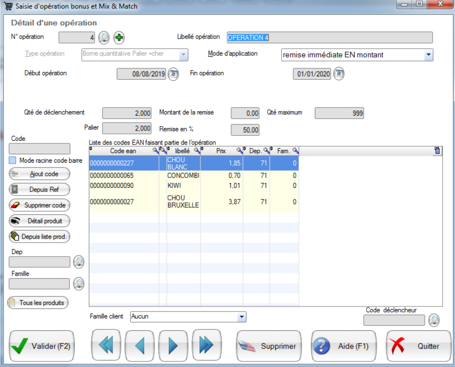 Selon l'opération il est possible d'affecter un code EAN, une famille, un département ou tous les produits.