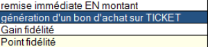 Les opérations fidélité permet d’attribuer une remise (en pourcentage ou en montant) ou des points par rapport à une certaine quantité ou pour un ensemble d’articles achetés. (La remise peut être effectuée en remise immédiate, en gain crédité sur carte fidélité ou en bon d'achat)