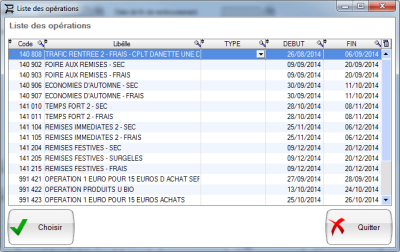 19 : Listes des codes de l'opération (attention on ne peux pas mixer produits, départements et familles)
