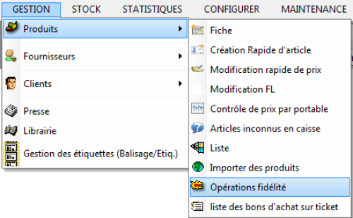 Pour afficher ou créer une opération fidélité, sélectionnez le menu “GESTION - Produits - Opérations fidélité”