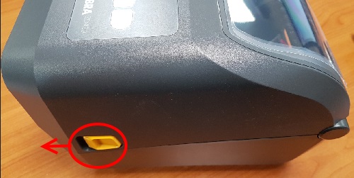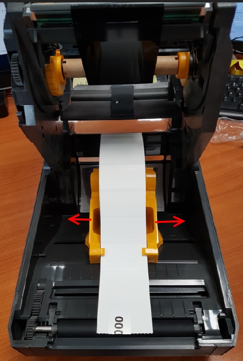 5. Pour changer le consommable cartonné ou autocollant, écartez les 2 plaques jaunes au bas de l'imprimante et enserrez le rouleau de consommable comme sur la photo ci-dessous