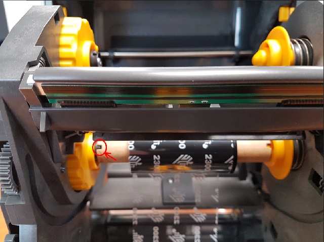 2.Inserrez le consommable neuf entre les 2 ronds jaunes du bas. (Bien vérifier l'encoche sur la partie gauche du rouleau en carton)