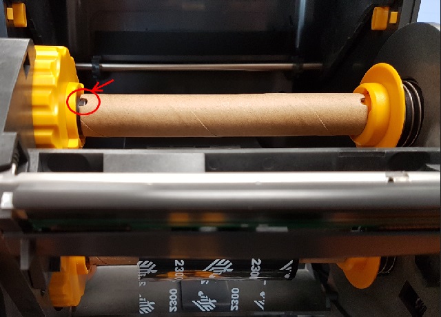 3. Enserrez le rouleau en carton vide sur entre les 2 ronds jaunes du haut. (Bien vérifier l'encoche sur la partie gauche du rouleau en carton)