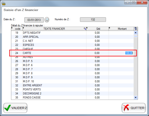 Vous aller passer 100 € de espèces en carte. Pour cela : Dans la ligne 24 « CARTE» saisissez « 100 ».