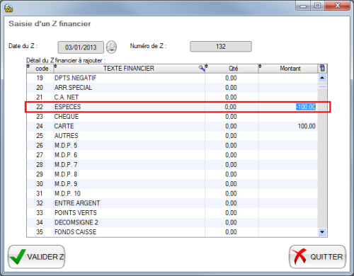 Et dans la ligne 22 « ESPECES » saisissez « -100 »