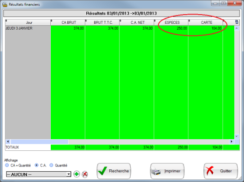 Dans la colonne « ESPECES », vous n'avez plus « 350.00 » mais bien « 250.00 » soit les 100 € que vous venez de déduire. Dans la colonne « CARTE », vous n’avez plus « 4.00 » mais bien « 104.00 » soit les 100 € que vous venez de rajouter.