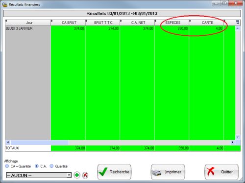 Prenez comme exemple la colonne « ESPECES » ou vous avez « 350.00 » et « CHEQUE » « 4.00 »