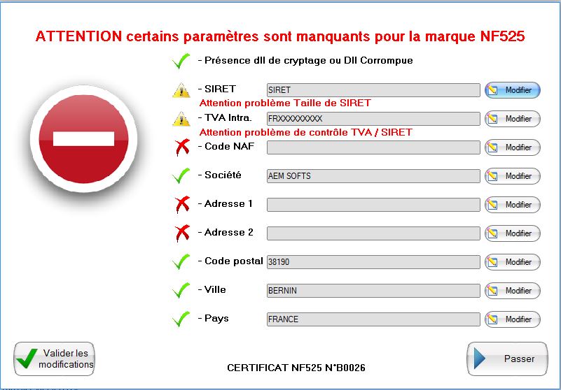 - Lors de la migration à la marque NF525 une fenêtre va s'afficher avec les champs obligatoires à saisir pour que le logiciel soit bien configuré à la marque NF525