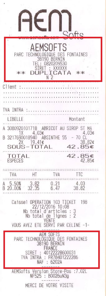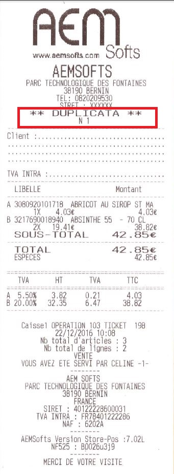 Attention lorsque vous modifiez une valeur d'entête, de société, version de logiciel ou autre .. le duplicata d'un ancien ticket va garder les informations imprimées sur l'original
