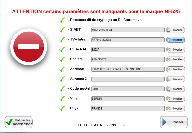 Si cette fenêtre s'affiche le logiciel ne pourra pas sortir de ticket de caisse NF525