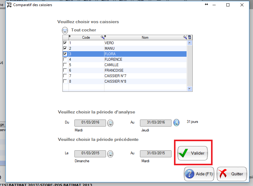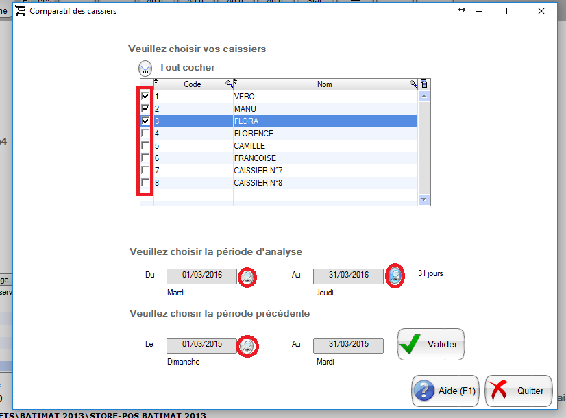 2: Choisir les caissiers et la périodes d'analyse et la période précédente.