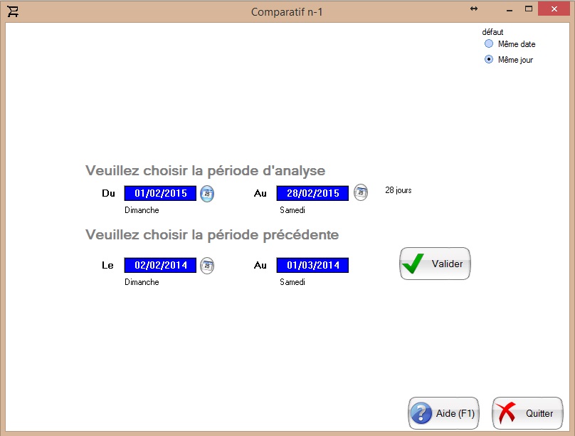 En choisissant la case Même jour, la période précédente se remplis automatiquement aux même jour de l'année précédente :