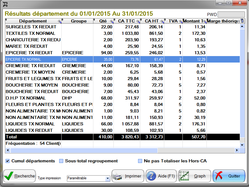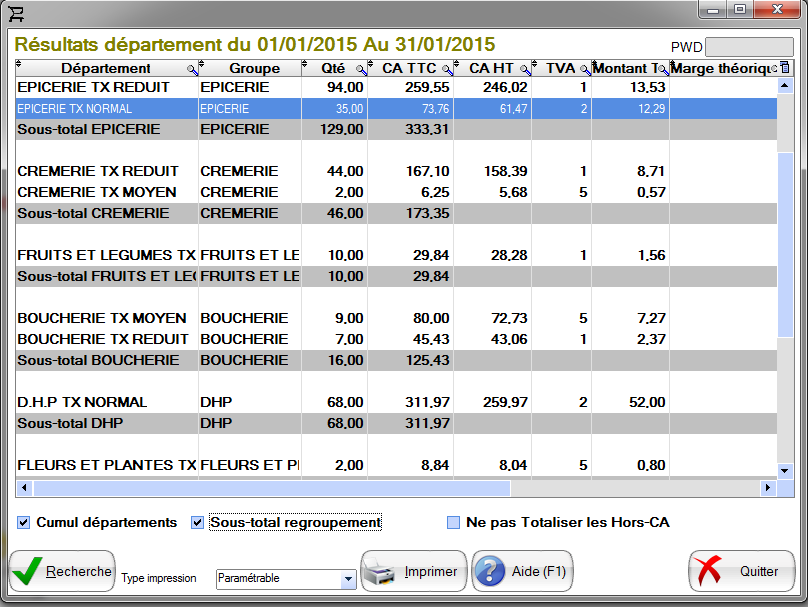 Vous verrez alors pour chaque Département le libelé, la quantité de produits vendus, le CA TTC ET HT, ainsi que les TVA.