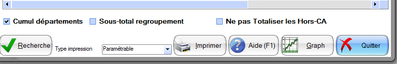 Le bas de la fenêtre vous permets de sélectionner différentes options vous permettant ainsi d'afficher des sous-totaux par regroupement et/ou de ne pas comptabiliser le Hors CA (par exemple: française des jeux ou timbre fiscaux).