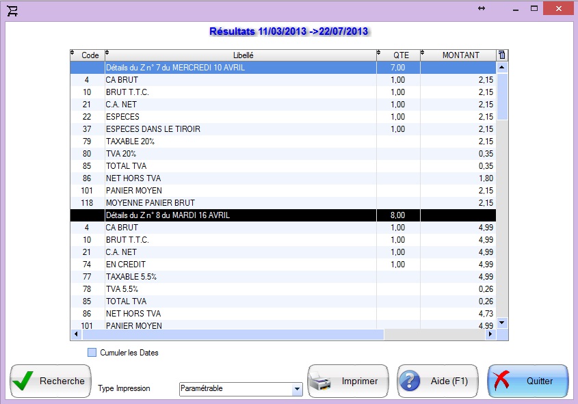 Elle vous affiche a l’écran le détail de chaque clôture Z effectué sur la période sélectionnée.