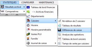 Pour accéder au tableau des différences de caisse sélectionnez le menu STATISTIQUES - Résultats archivé - Caissiers - Différences de caisse