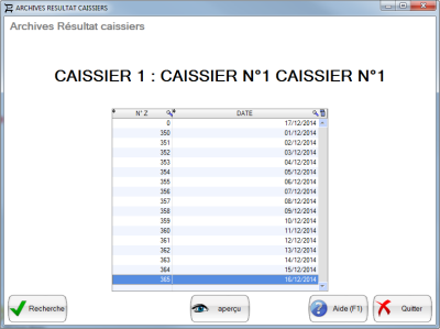 La liste de tous les Z caissiers de cette période apparaît. Sélectionnez le Z qu vous souhaiter réimprimer.