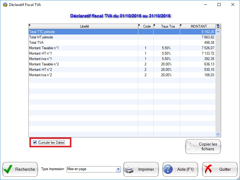 En cochant l'option “cumuler les dates” la visualisation des résultats sera regroupée comme ceci:  Cette option est très utile pour sortir les résultats par année/mois/semaine.